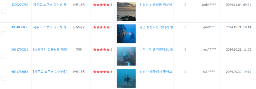 마스터 대 다이버 비율 최대 1:4로 다이빙을 진행합니다. 이것은 비슷한 레벨의 다이버로 그룹을 만들어 진행하기때문에 불편함이 없습니다. 몰속에서 최대한 많은 시간을 다이빙 할 수 있도록 노력합니다. 또한 레벨별 다양한 포인트를 제공하며, 항상 안전한 최우선인 다이빙이 되도록 노력하겠습니다.